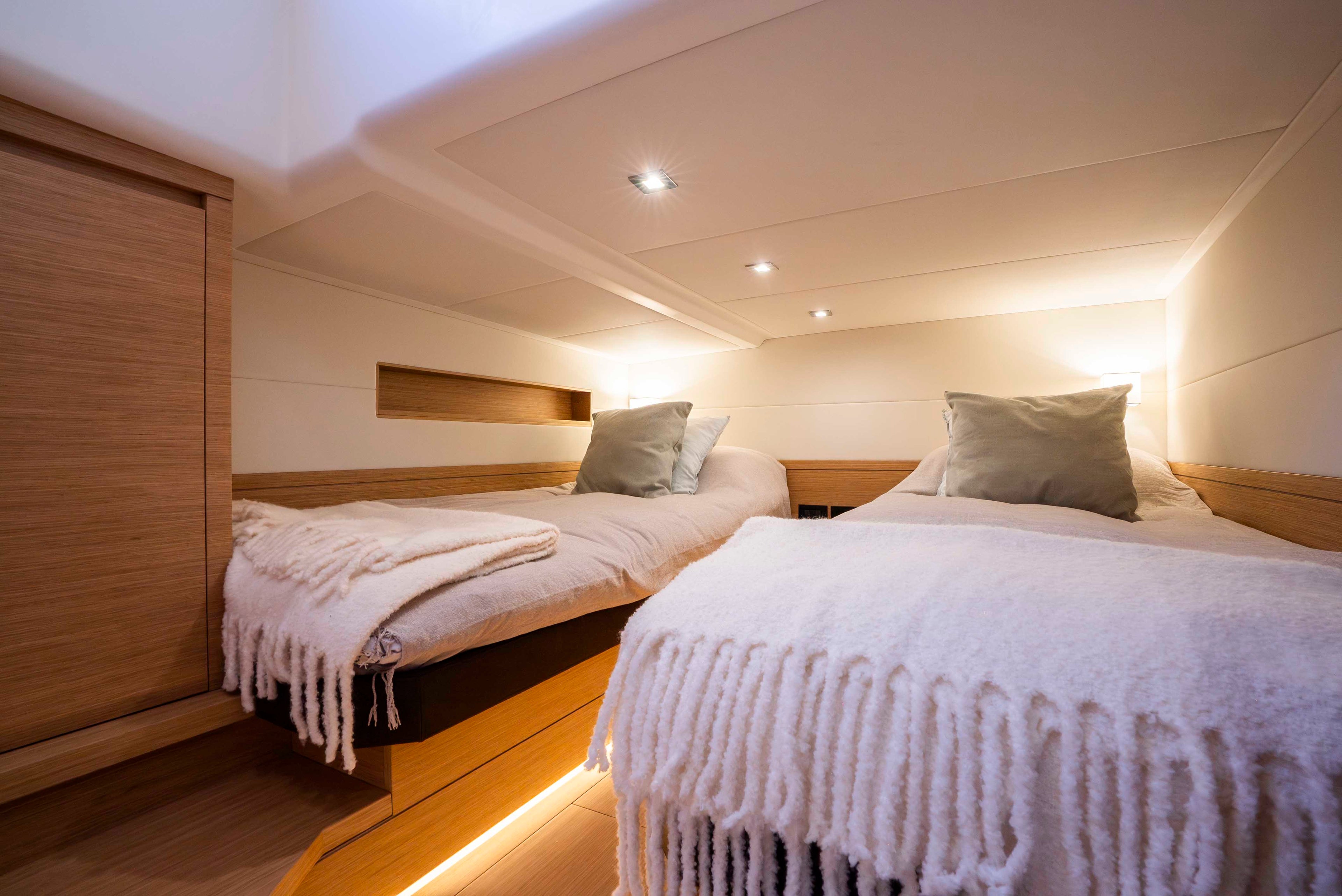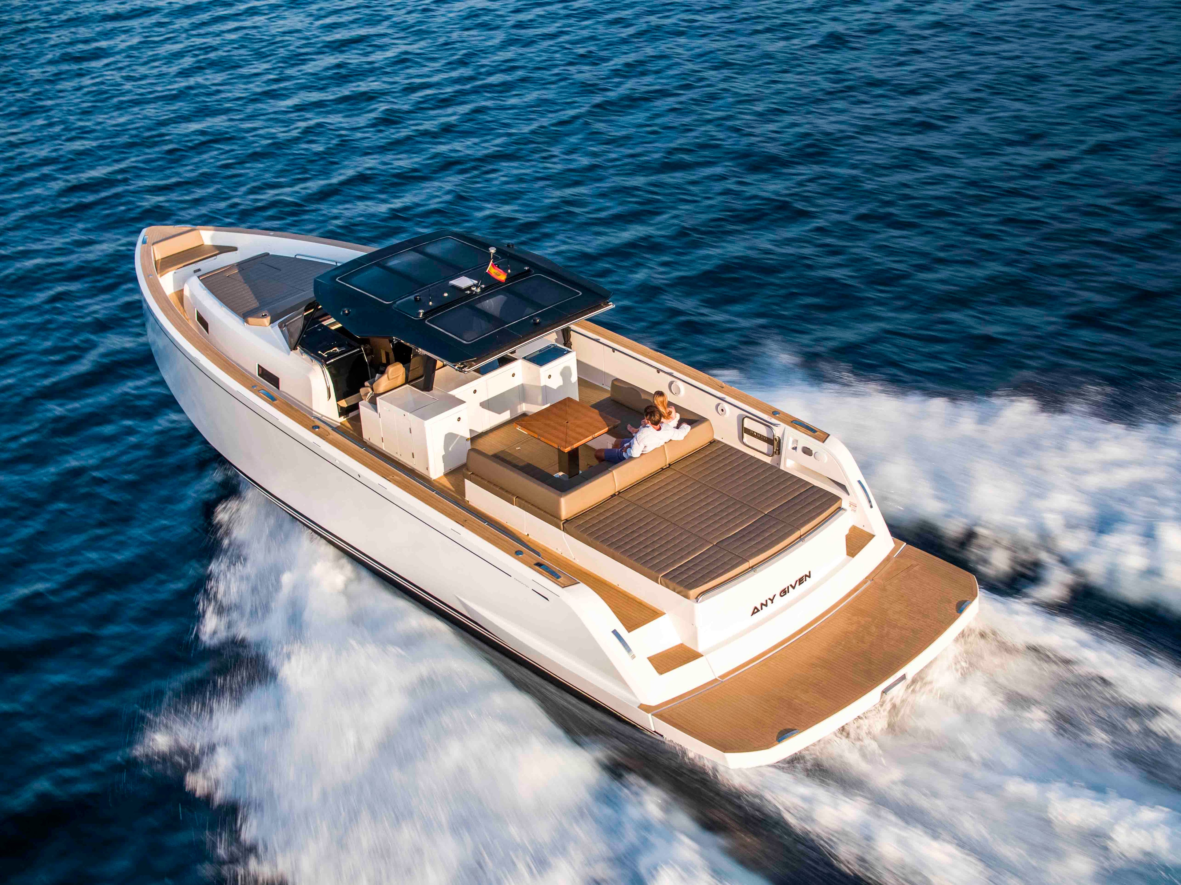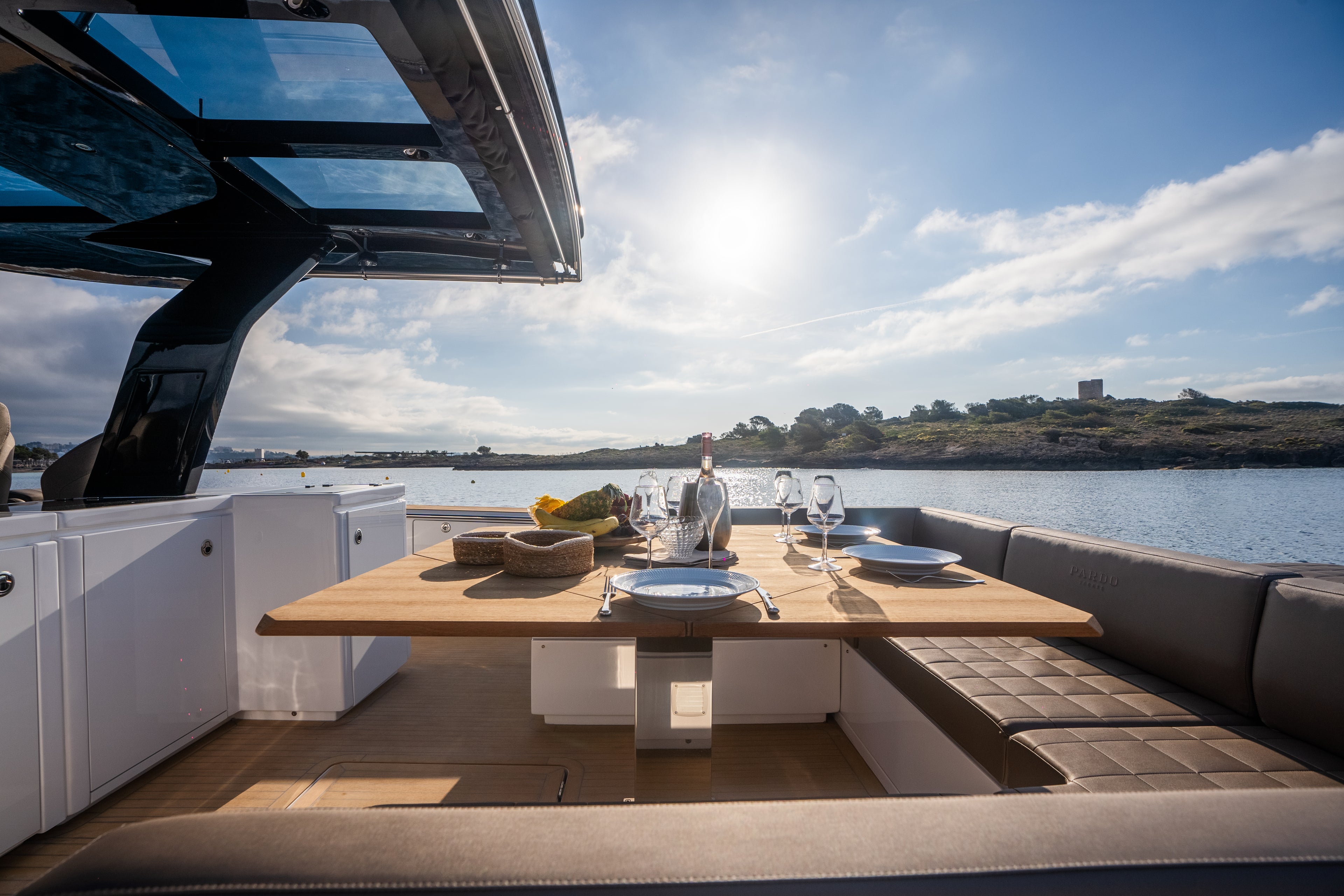 The 16-meter Pardo 50 features a full walkaround layout with an iconic inverted bow, raised bulwarks, and integrated sunpads at both bow and aft. A 16 m² carbon fiber T-top shades the central deck area, optimizing space and protection. The layout balances performance, usability, and high-end Italian engineering. The yacht is equipped with Air condition.