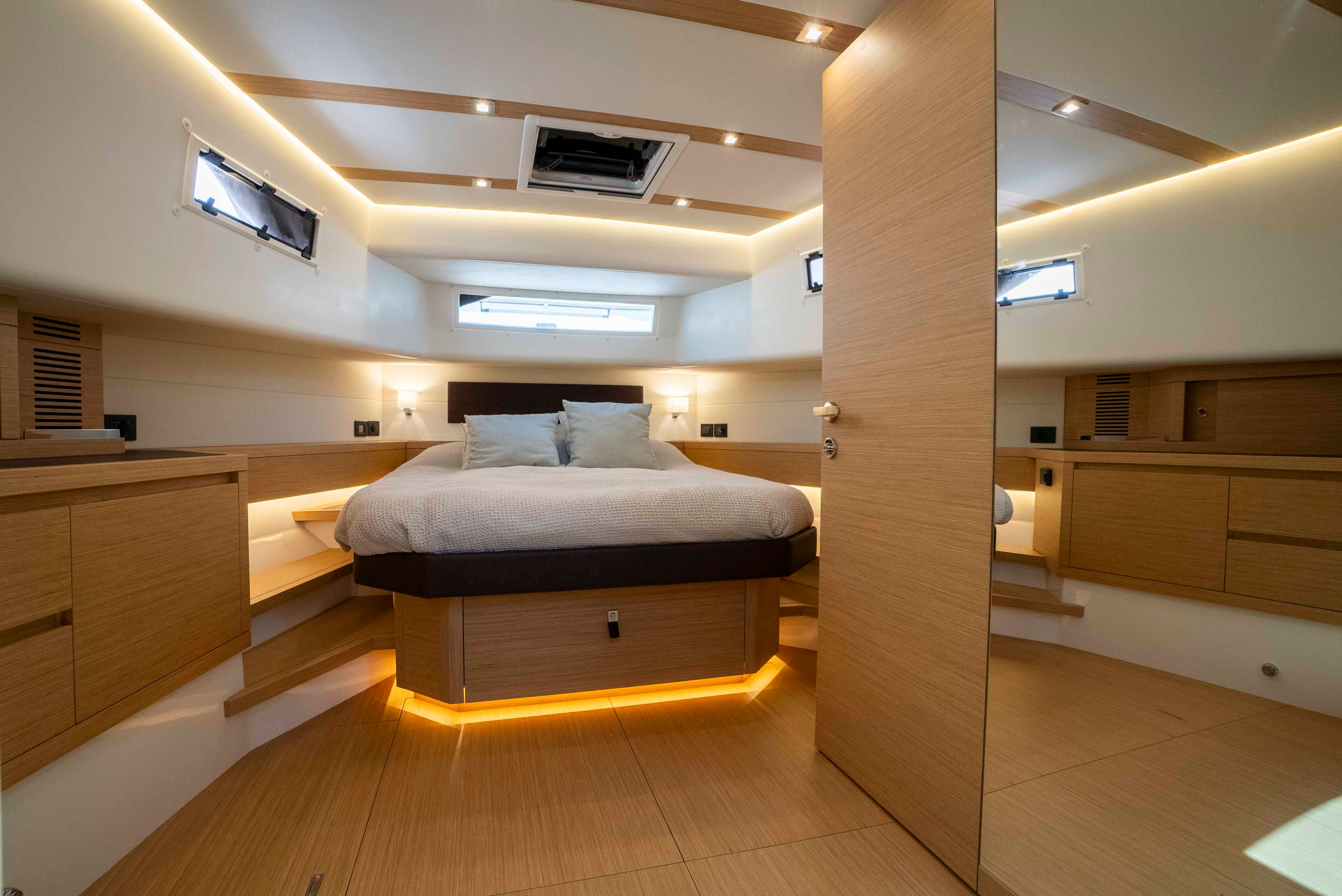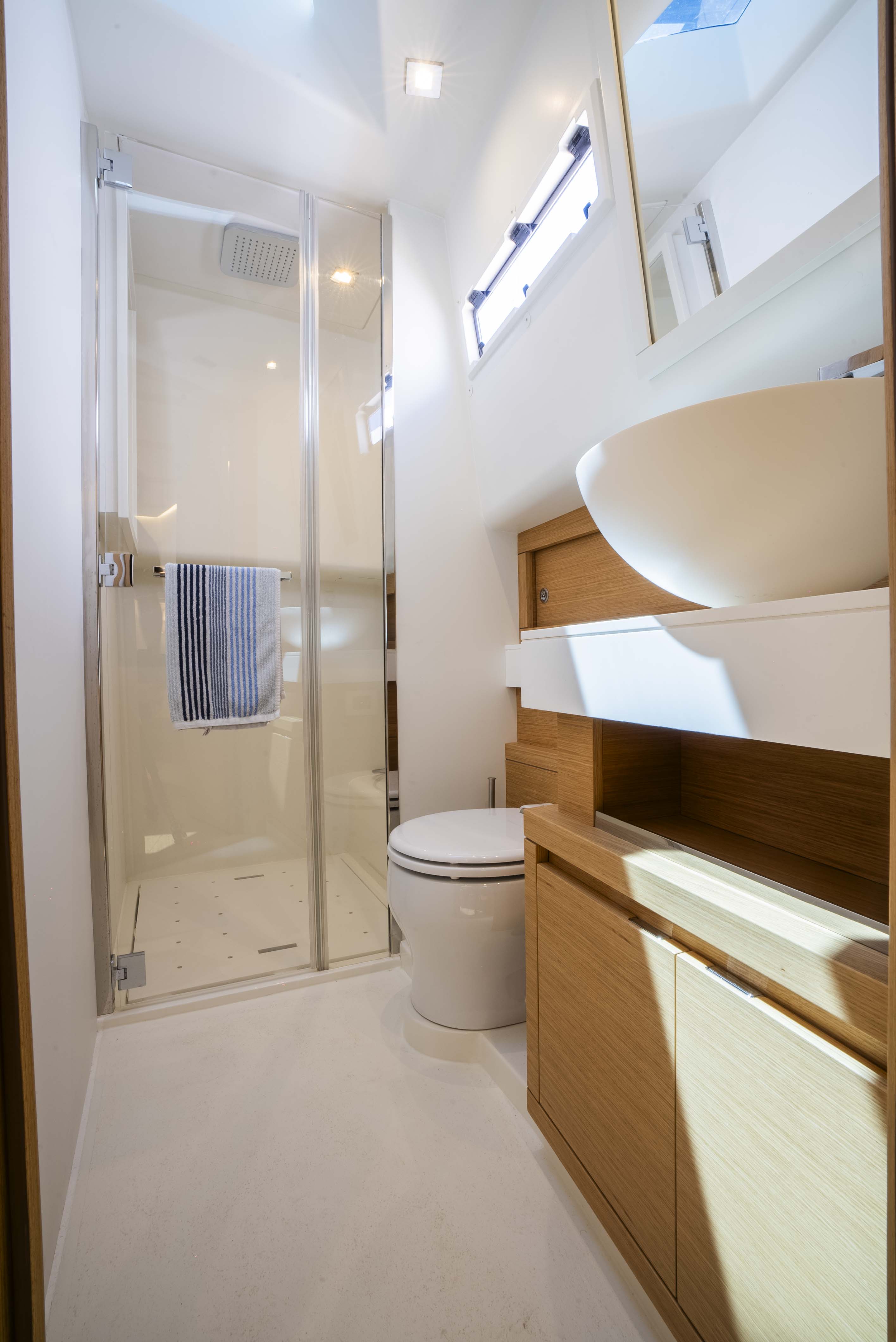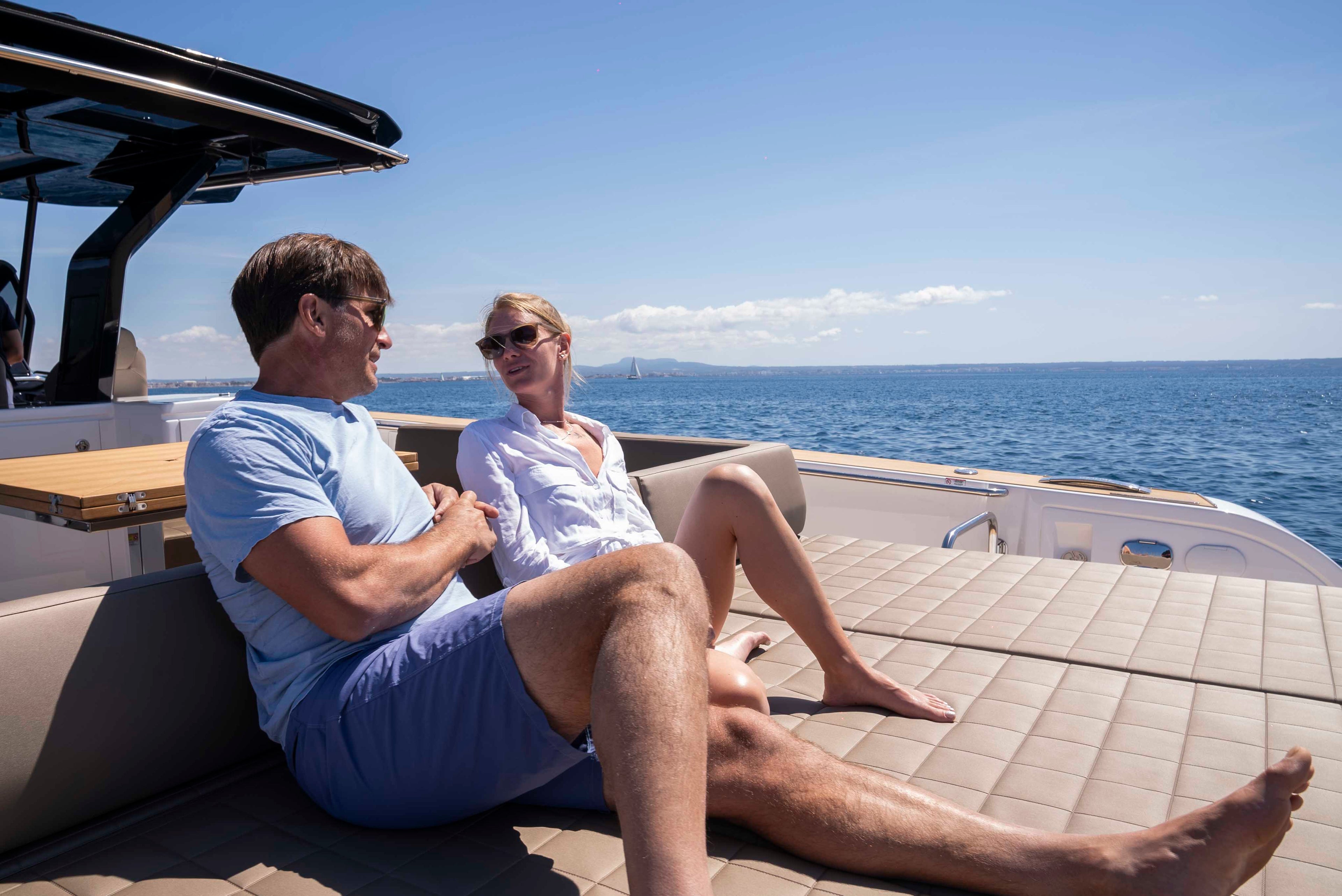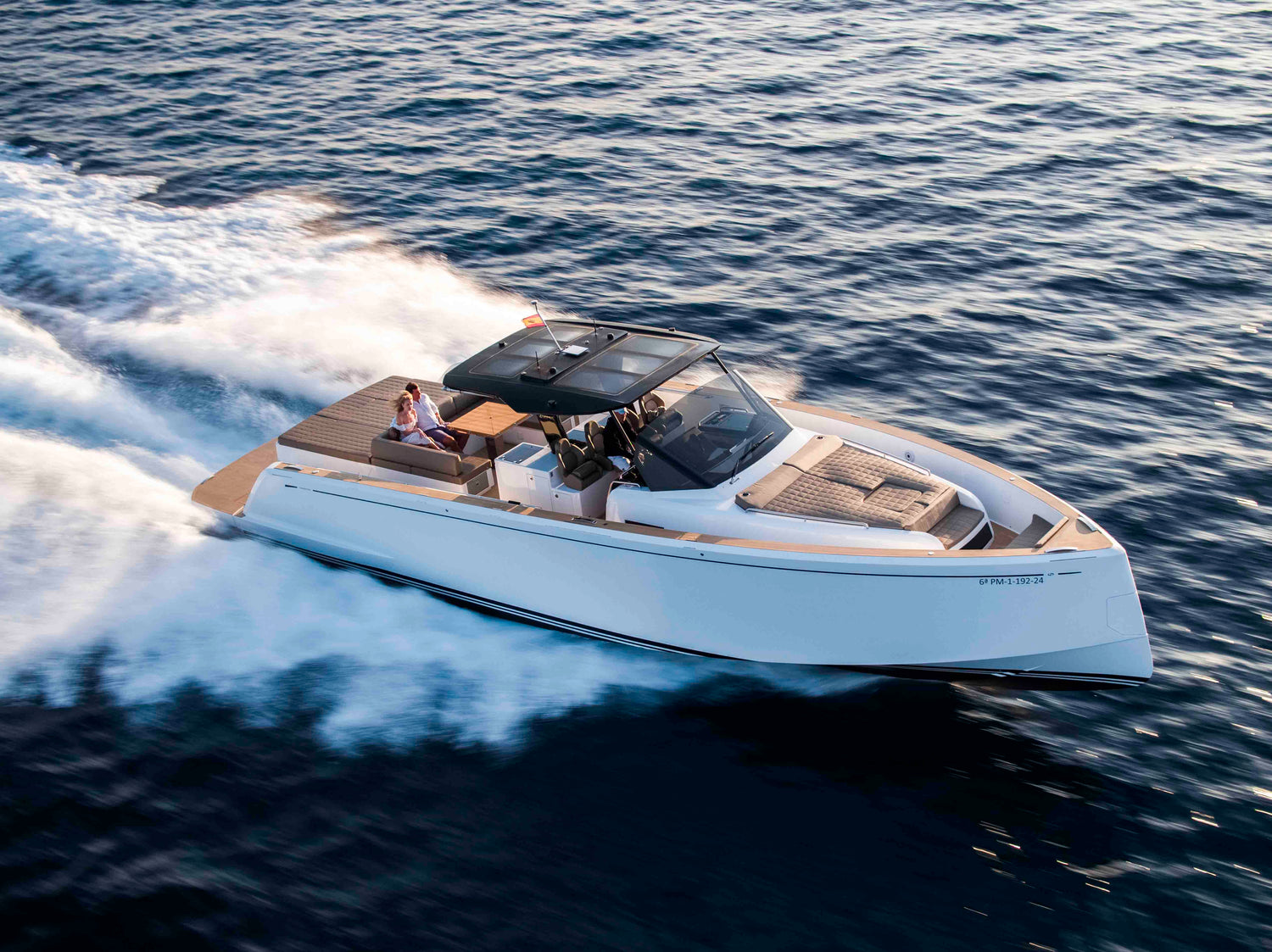 The 16-meter Pardo 50 features a full walkaround layout with an iconic inverted bow, raised bulwarks, and integrated sunpads at both bow and aft. A 16 m² carbon fiber T-top shades the central deck area, optimizing space and protection. The layout balances performance, usability, and high-end Italian engineering. The yacht is equipped with Air condition.